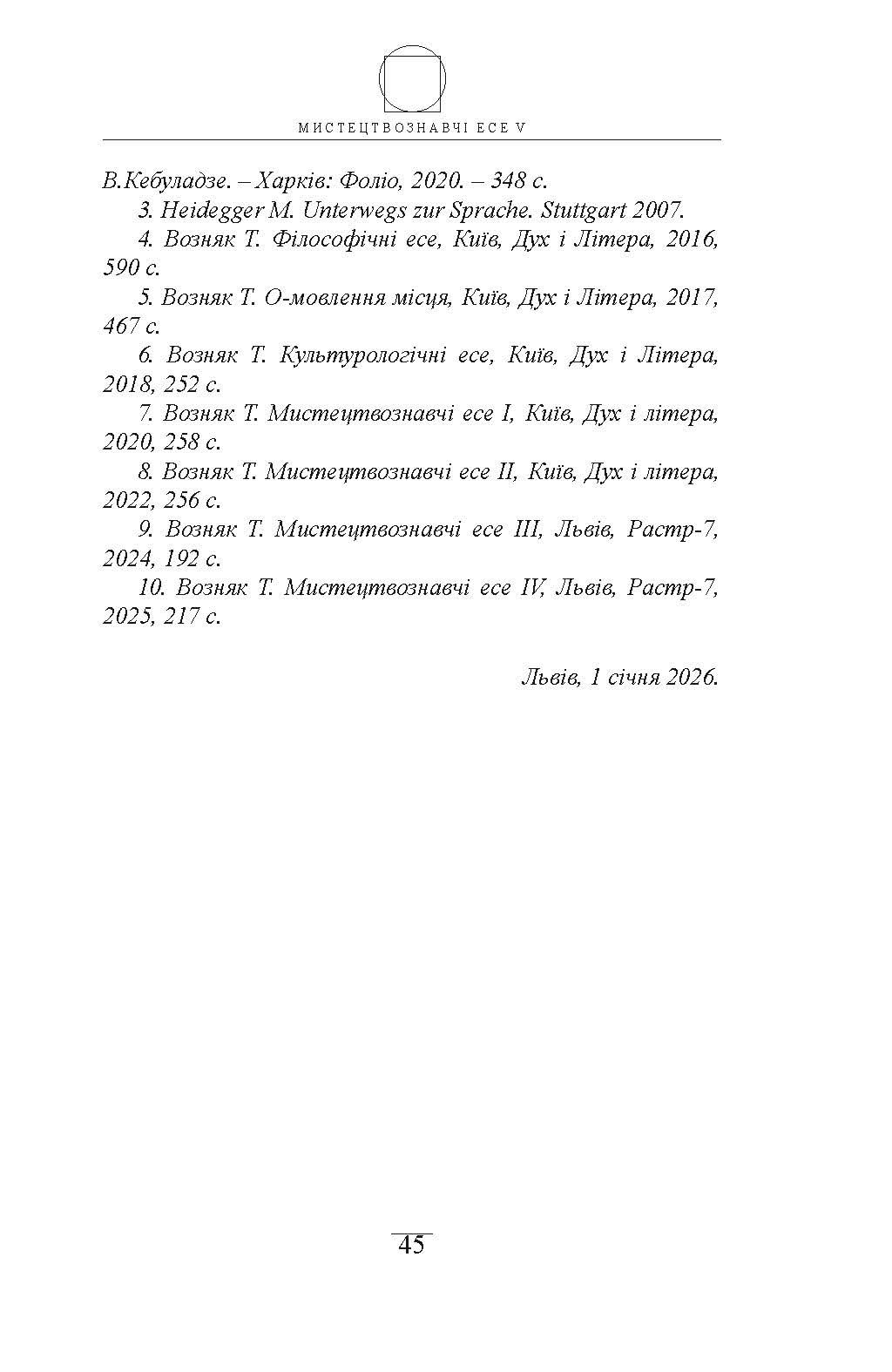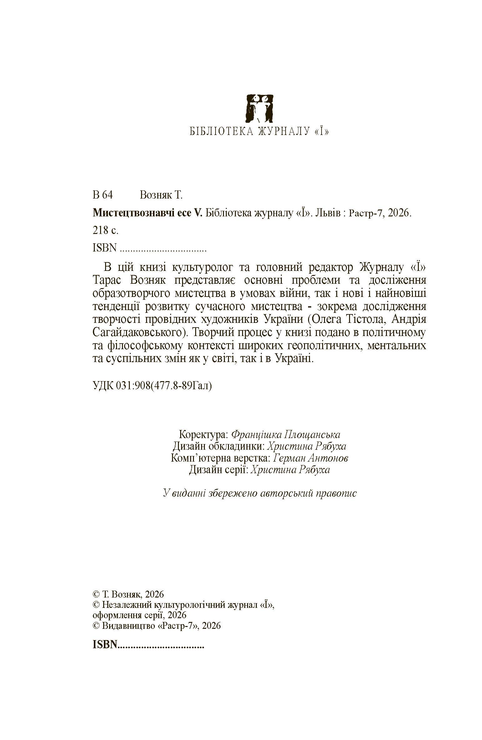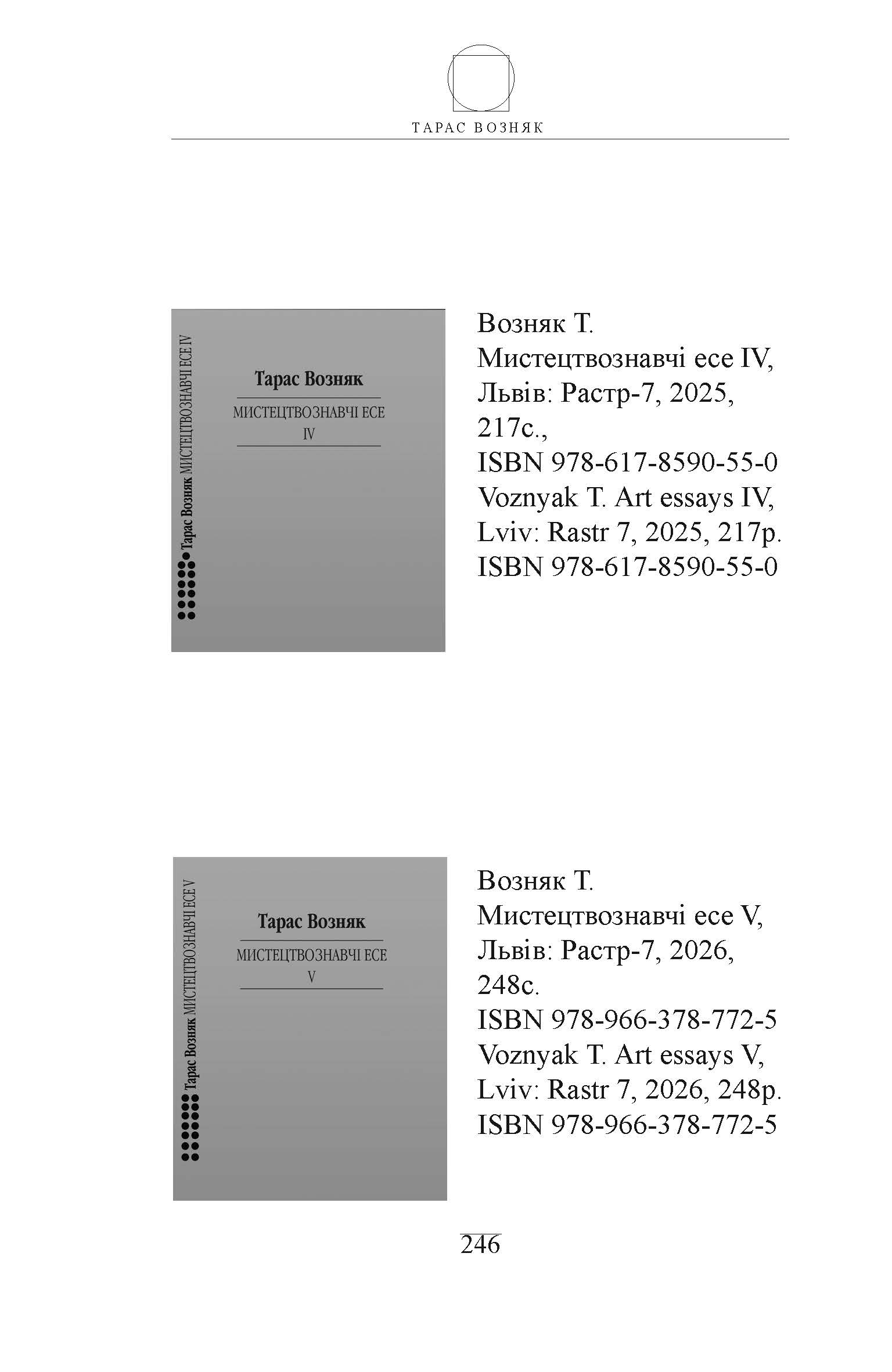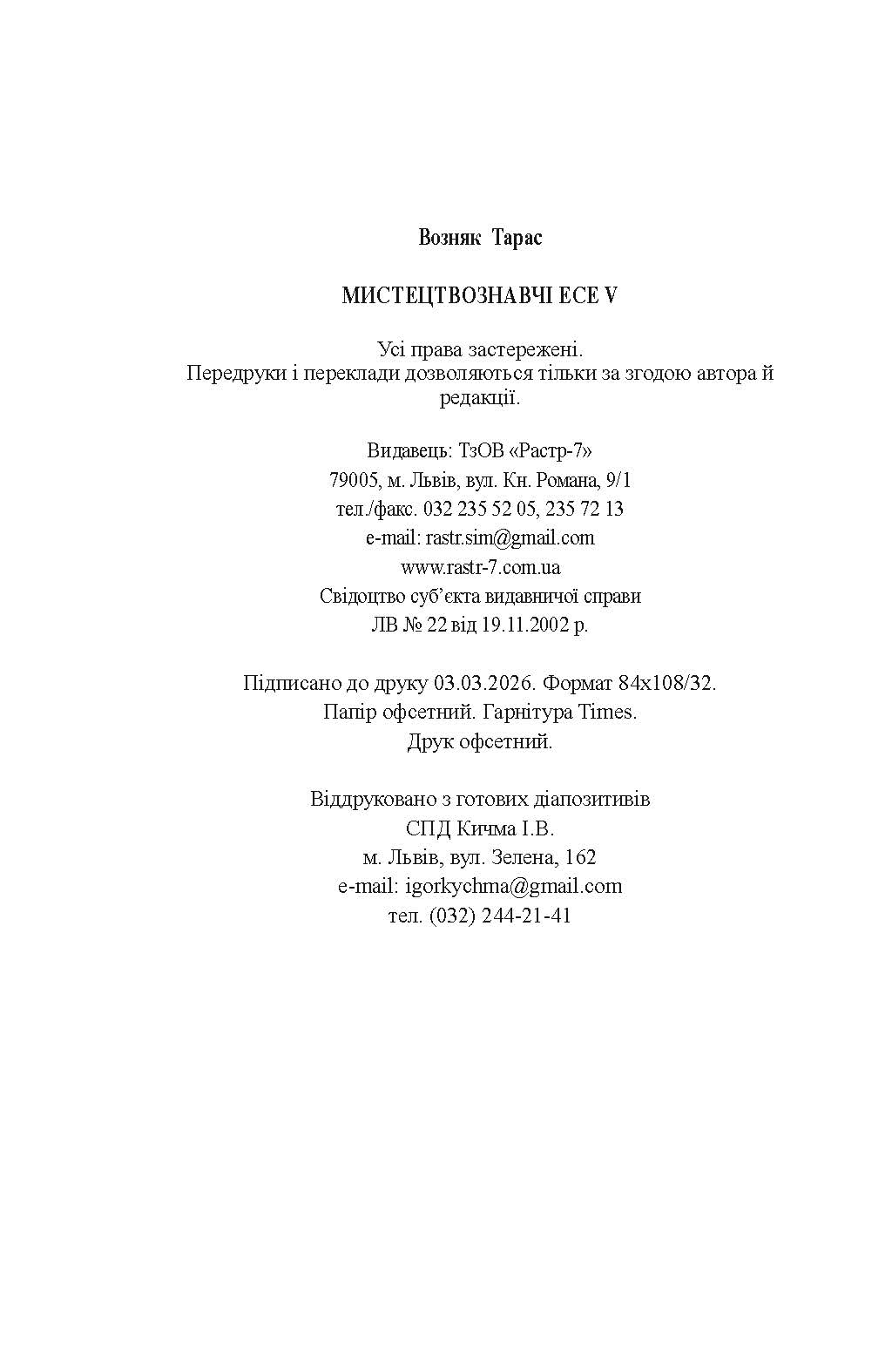 Т.Возняк. Мистецтвознавчі есе V. - © Видавництво «Растр-7», 2026. - 248 с.